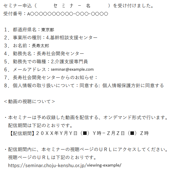 (2)自動返信メールに、動画視聴用ページのURL、パスワードが記載されています。配信期間中にご自身でアクセスし、ご視聴ください。